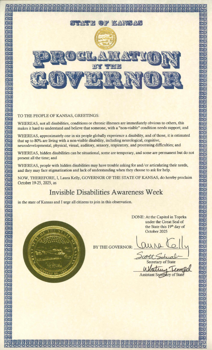 Governor Laura Kelly has officially proclaimed October 19-25, 2025 as Invisible disabilities awareness week' in Kansas. This recognition honors the millions of Kansans with conditions that are not immediately apparent but significantly affect their daily lives. Invisible, or “hidden,” disabilities can include neurological, cognitive, mental health, sensory, and chronic medical conditions. Though often unseen, their impact is deeply felt, from barriers in education and employment to challenges in accessing understanding and support.